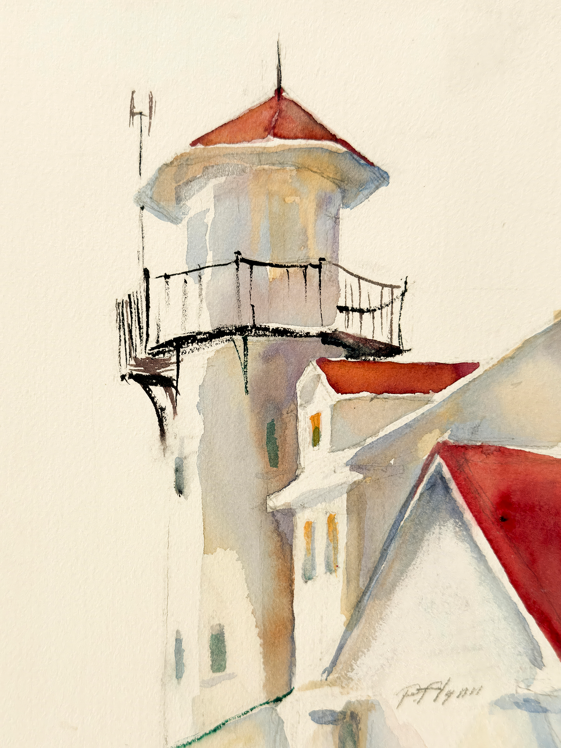 This elegant watercolor features a coastal lighthouse with a distinctive red-roofed tower and charming architectural details. Soft washes and clean lines capture the light and airy feel of a seaside morning, making it a timeless piece for lovers of nautical and New England charm.