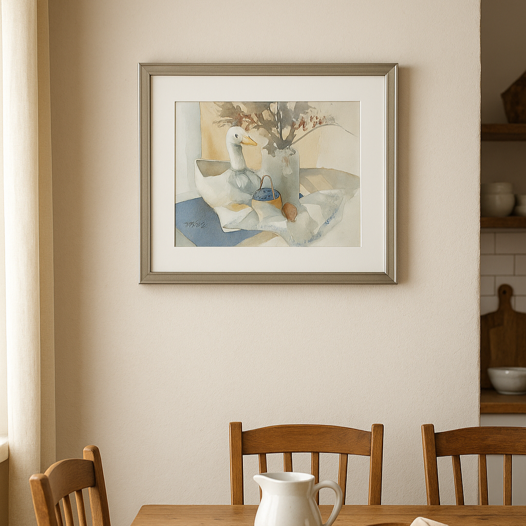 This inviting watercolor still life evokes the warmth of farmhouse living, with a graceful white duck figure beside a simple vase of dried flowers. Resting on a blue-and-white embroidered cloth, the scene is bathed in soft light, capturing the charm and comfort of rustic country style.