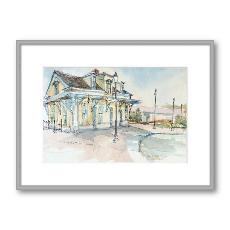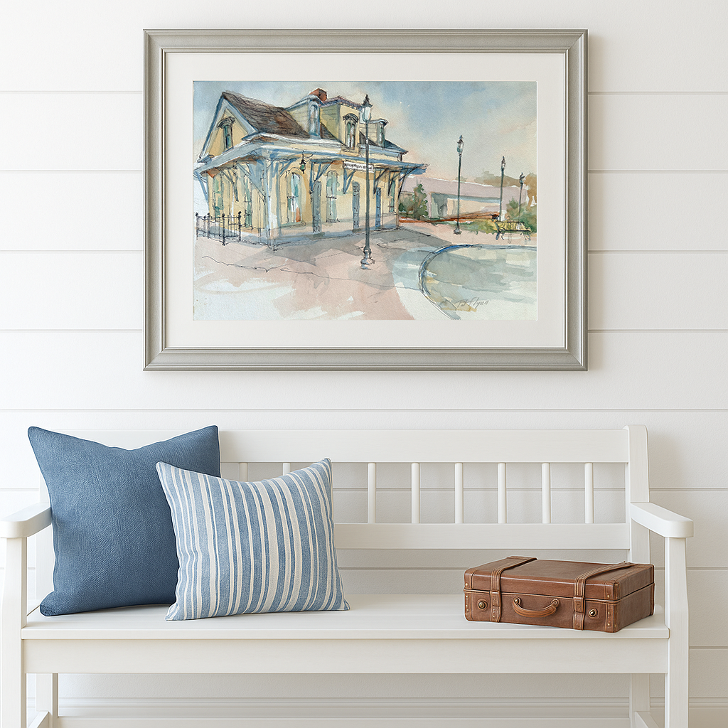 This detailed watercolor captures the historic Kingston, Rhode Island train station, its charming architecture framed by vintage-style lampposts. Soft washes of warm and cool tones bring out the building’s Victorian-era details, evoking the timeless character of this beloved New England landmark.