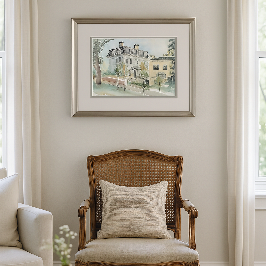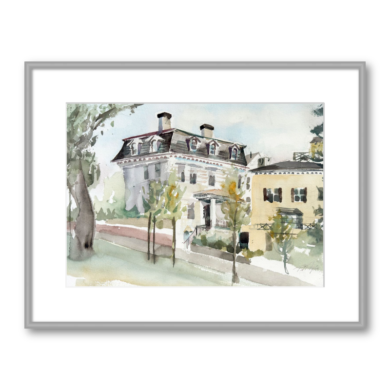 This charming watercolor captures the elegance of a historic street, featuring a stately three-story home with a mansard roof and classic architectural details. Soft washes and delicate lines bring the tree-lined setting to life, evoking the timeless grace of a New England neighborhood.