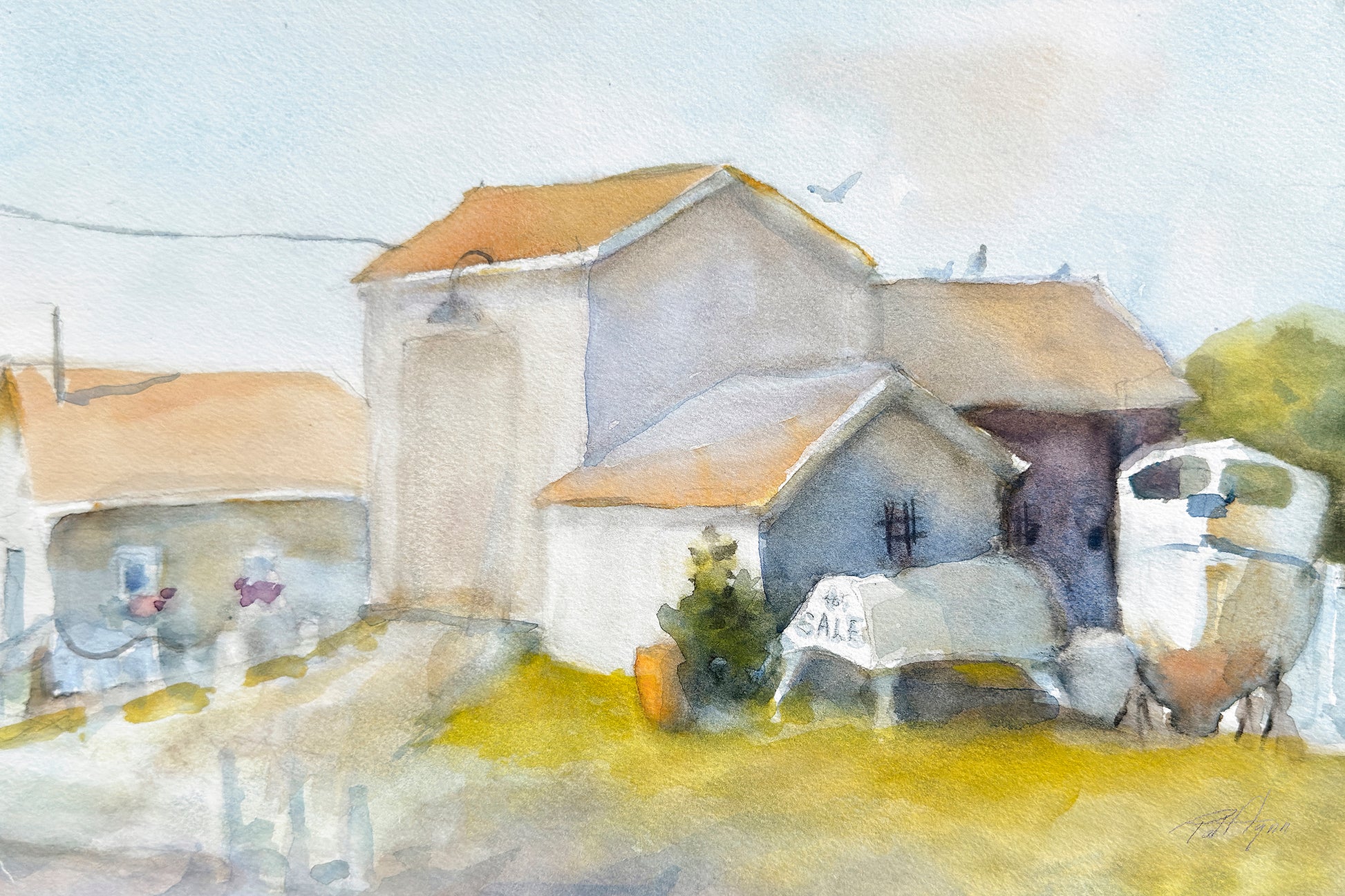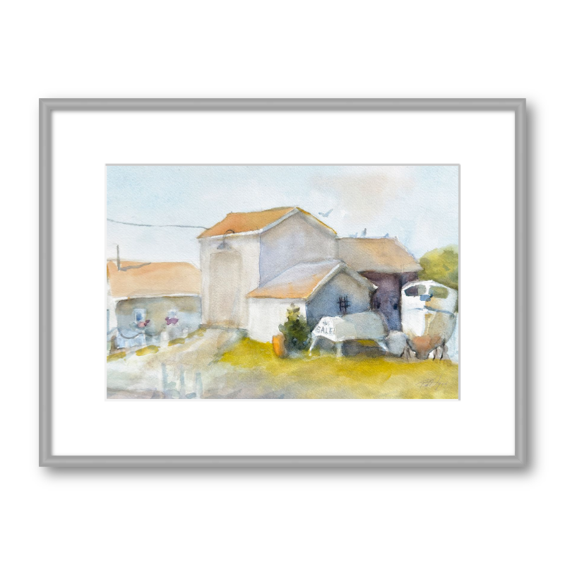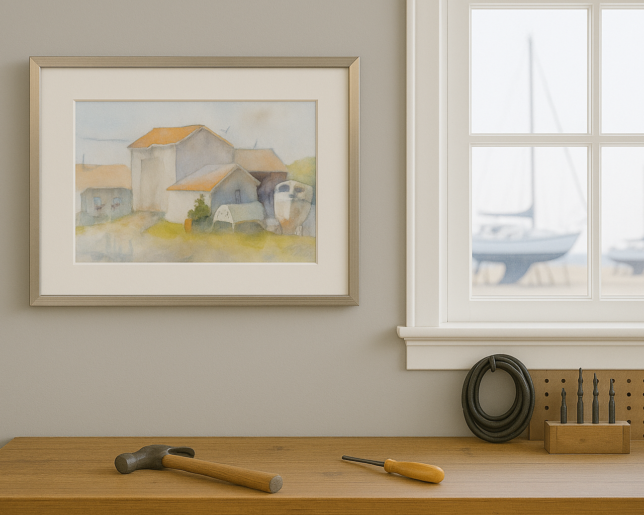 This bright and cheerful watercolor captures a sunlit coastal scene, where weathered boathouses and a resting vessel hint at life by the sea. Soft washes of blue and gold evoke salty breezes and quiet harbor days, bringing a warm, nostalgic charm to the composition.