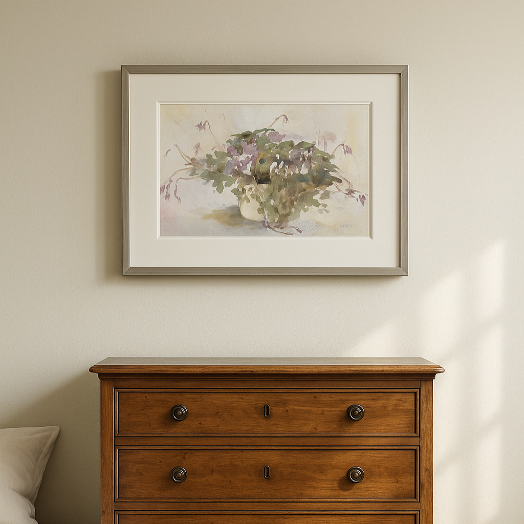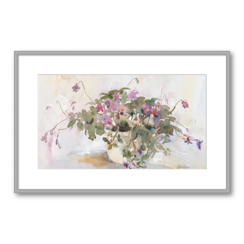A delicate watercolor capturing violets spilling gently from a cream pot, painted with soft, airy washes and graceful brushwork. This piece brings a sense of quiet beauty and calm to any space.