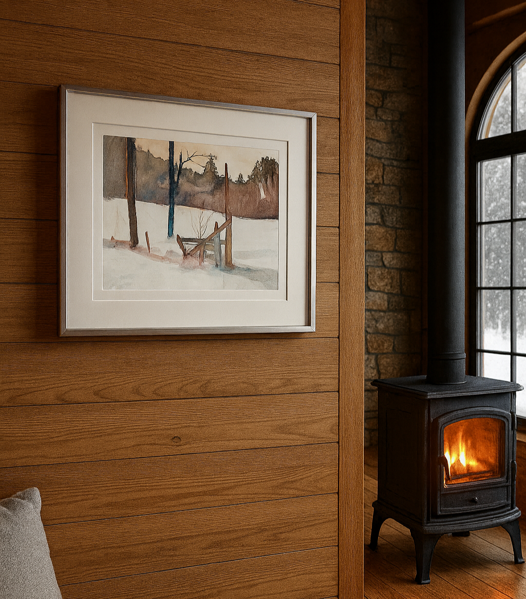 This serene watercolor captures a quiet winter landscape, where a weathered wooden gate and fence stand amid a blanket of fresh snow. Soft, cool tones and gentle brushstrokes convey the stillness and beauty of a peaceful countryside in winter.
